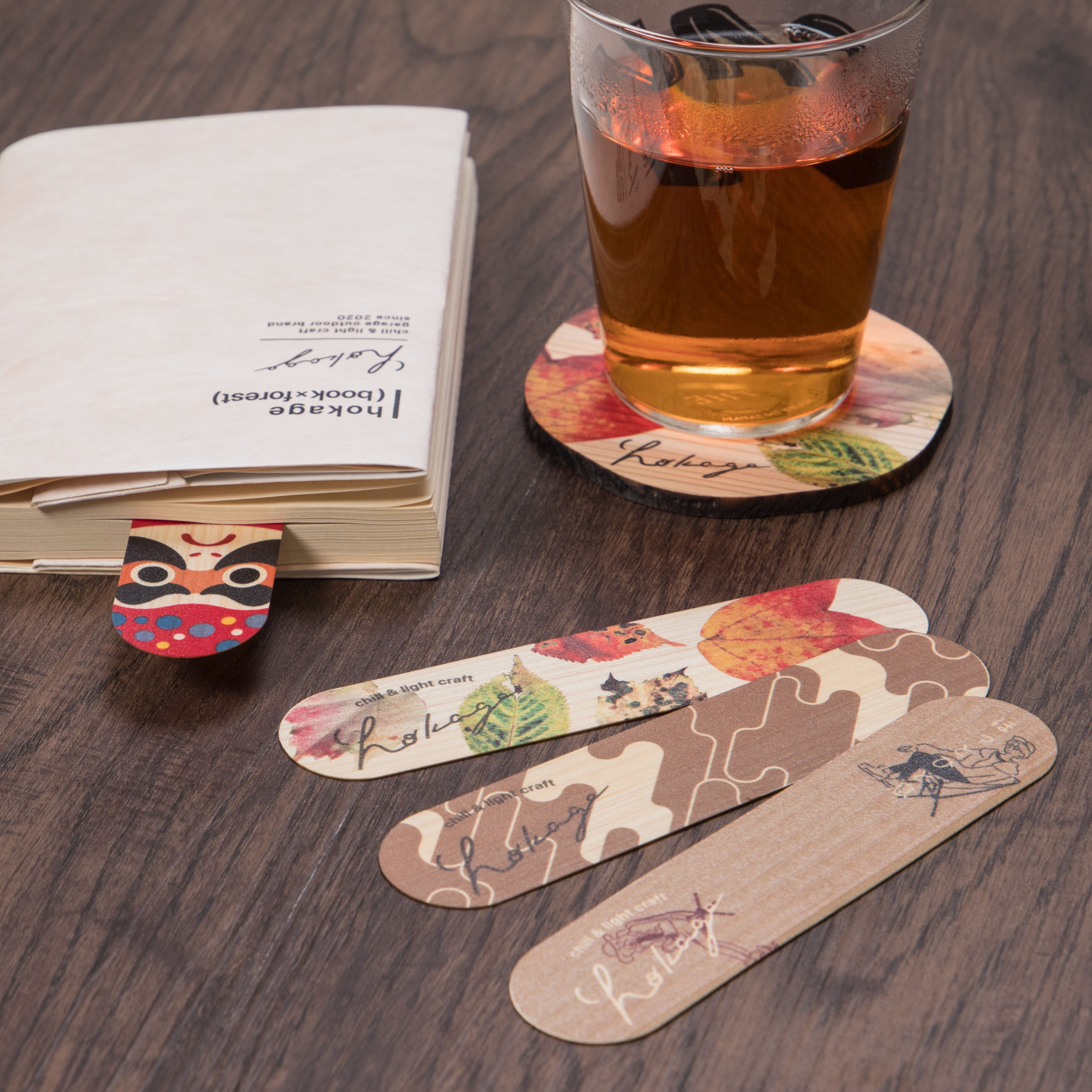 ◉セット01:しおり3枚(リーフ、雲フラージュ(茶)、イラスト)+ブックカバー2枚