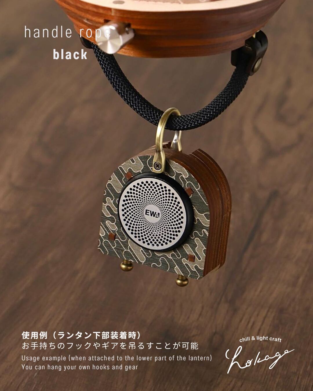 ランタンの持ち手としても使えるほか、ギボシがついた商品(hokageランタン、EWAスピーカーカバー)に装着して、フックやスタンドを利用して吊り下げることも可能。クライミングロープなどに使われるパラコードを使用しています。人と被らないカラーでアクセントにも。